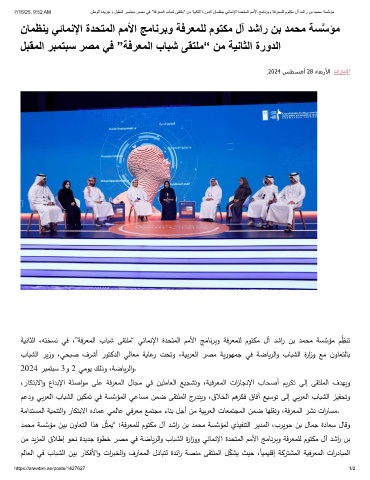 7/16/25, 9:52 AM نطوﻟا ةدﯾرﺟ › لﺑﻘﻣﻟا رﺑﻣﺗﺑﺳ رﺻﻣ ﻲﻓ ”ﺔﻓرﻌﻣﻟا بﺎﺑﺷ ﻰﻘﺗﻠﻣ“ نﻣ ﺔﯾﻧﺎﺛﻟا ةرودﻟا نﺎﻣظﻧﯾ ﻲﺋﺎﻣﻧﻹا ةدﺣﺗﻣﻟا مﻣﻷا ﺞﻣﺎﻧرﺑو ﺔﻓرﻌﻣﻠﻟ موﺗﻛﻣ لآ دﺷار نﺑ دﻣﺣﻣ ﺔﺳﱠﺳؤﻣ