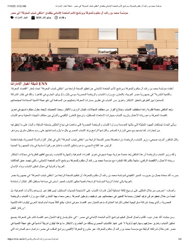 7/16/25, 9:52 AM تارﺎﻣﻹا رﺎﺑﺧأ ﺔﻛﺑﺷ - رﺻﻣ ﻲﻓ "ﺔﻓرﻌﻣﻟا بﺎﺑﺷ ﻰﻘﺗﻠﻣ" نﺎﻣظﻧﯾ ﻲﺋﺎﻣﻧﻹا ةدﺣﺗﻣﻟا مﻣﻷا ﺞﻣﺎﻧرﺑو ﺔﻓرﻌﻣﻠﻟ موﺗﻛﻣ لآ دﺷار نﺑ دﻣﺣﻣ ﺔﺳﱠﺳؤﻣ