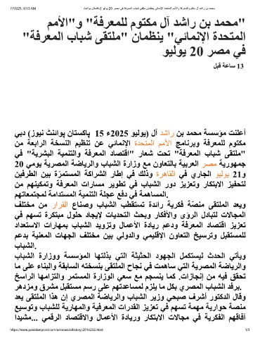 7/16/25, 9:53 AM ٹﻧﺋاوﺑ نﺎﺗﺳﮐﺎﺑ | وﯾﻟوﯾ 20 رﺻﻣ ﻲﻓ ﺔﻓرﻌﻣﻟا بﺎﺑﺷ ﻰﻘﺗﻠﻣ نﺎﻣظﻧﯾ ﻲﺋﺎﻣﻧﻹا ةدﺣﺗﻣﻟا مﻣﻷاو ﺔﻓرﻌﻣﻠﻟ موﺗﻛﻣ لآ دﺷار نﺑ دﻣﺣﻣ