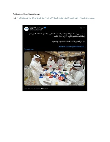 Publication: X – Al Wasat Kuwait Link: " دغلا ةداق دادعلإ "تيوكلا يف ةفرعملا ةلحر" نم ةريخلأا ةطحملا نامظني "يئامنلإا ةدحتملا مملأا"و "ةفرعملل دشار نب دمحم