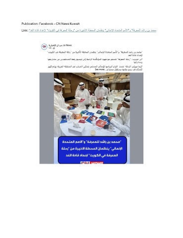 Publication: Facebook – CN News Kuwait Link: " دغلا ةداق دادعلإ "تيوكلا يف ةفرعملا ةلحر" نم ةريخلأا ةطحملا نامظني "يئامنلإا ةدحتملا مملأا"و "ةفرعملل دشار نب دمحم