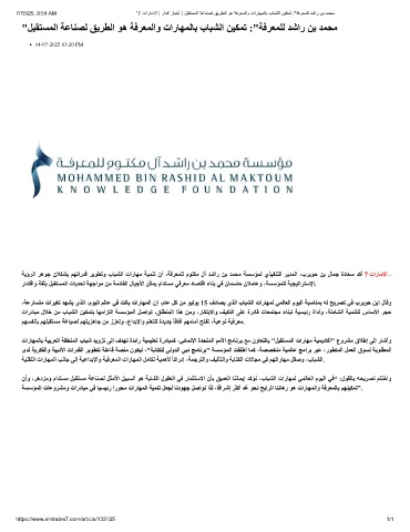 7/15/25, 9:54 AM "7 تارﺎﻣﻻا | رادﻟا رﺎﺑﺧأ | لﺑﻘﺗﺳﻣﻟا ﺔﻋﺎﻧﺻﻟ ﻖﯾرطﻟا وھ ﺔﻓرﻌﻣﻟاو تارﺎﮭﻣﻟﺎﺑ بﺎﺑﺷﻟا نﯾﻛﻣﺗ :"ﺔﻓرﻌﻣﻠﻟ دﺷار نﺑ دﻣﺣﻣ