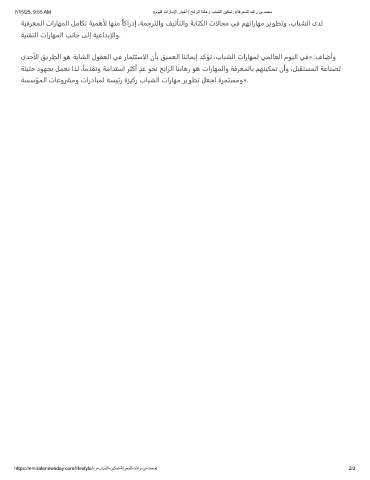 ىﺪﺟألا ﻖﻳﺮﻄﻟا ﻮﻫ ﺔﺑﺎﺸﻟا لﻮﻘﻌﻟا ﻲﻓ رﺎﻤﺜﺘﺳالا نﺄﺑ ﻖﻴﻤﻌﻟا ﺎﻨﻧﺎﻤﻳإ ﺪﻛﺆﻧ ،بﺎﺒﺸﻟا تارﺎﻬﻤﻟ ﻲﻤﻟﺎﻌﻟا مﻮﻴﻟا ﻲﻓ» :فﺎﺿأو