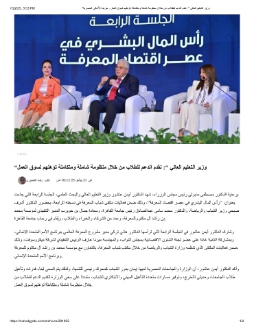 7/22/25, 3:53 PM "ﺔﯾرﺻﻣﻟا ﻲﻟﺎھﻷا ةدﯾرﺟ - لﻣﻌﻟا قوﺳﻟ مﮭﻠھؤﺗ ﺔﻠﻣﺎﻛﺗﻣو ﺔﻠﻣﺎﺷ ﺔﻣوظﻧﻣ لﻼﺧ نﻣ بﻼطﻠﻟ مﻋدﻟا مدﻘﻧ :" ﻲﻟﺎﻌﻟا مﯾﻠﻌﺗﻟا رﯾزو