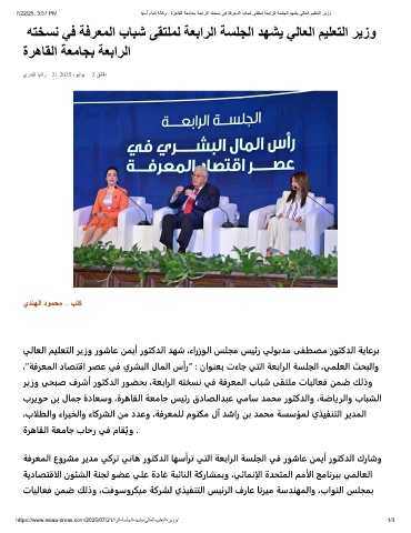 7/22/25, 3:57 PM ﺎﯾﺳأ ءﺎﺑﻧأ ﺔﻟﺎﻛو - ةرھﺎﻘﻟا ﺔﻌﻣﺎﺟﺑ ﺔﻌﺑارﻟا ﮫﺗﺧﺳﻧ ﻲﻓ ﺔﻓرﻌﻣﻟا بﺎﺑﺷ ﻰﻘﺗﻠﻣﻟ ﺔﻌﺑارﻟا ﺔﺳﻠﺟﻟا دﮭﺷﯾ ﻲﻟﺎﻌﻟا مﯾﻠﻌﺗﻟا رﯾزو
