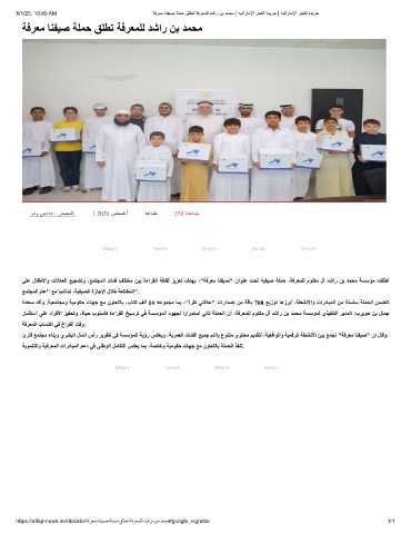 ﻰﻠﻋ لﺎﻔطﻷاو تﻼﺋﺎﻌﻟا ﻊﯿﺠﺸﺗو ،ﻊﻤﺘﺠﻤﻟا تﺎﺌﻓ ﻒﻠﺘﺨﻣ ﻦﯿﺑ ةءاﺮﻘﻟا ﺔﻓﺎﻘﺛ ﺰﯾﺰﻌﺗ فﺪﮭﺑ ،"ﺔﻓﺮﻌﻣ ﺎﻨﻔﯿﺻ" ناﻮﻨﻋ ﺖﺤﺗ ﺔﯿﻔﯿﺻ ﺔﻠﻤﺣ ،ﺔﻓﺮﻌﻤﻠﻟ مﻮﺘﻜﻣ لآ ﺪﺷار ﻦﺑ ﺪﻤﺤﻣ ﺔﺴﺳﺆﻣ ﺖﻘﻠطأ