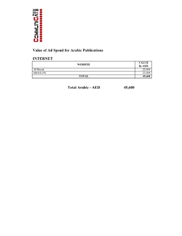 Value of Ad Spend for Arabic Publications INTERNET VALUE WEBSITE In AED Al Bayan 22,000 MENA FN 23,600 TOTAL 45,600 Total Arabic - AED 45,600