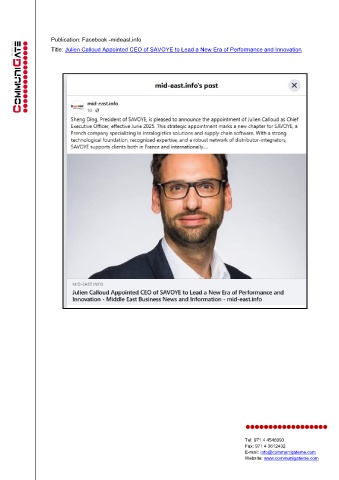 Publication: Facebook -mideast.info Title: Julien Calloud Appointed CEO of SAVOYE to Lead a New Era of Performance and Innovation Tel: 971 4 4546093 Fax: 971 4 3612432 E-mail: info@communigateme.com Website: www.communigateme.com
