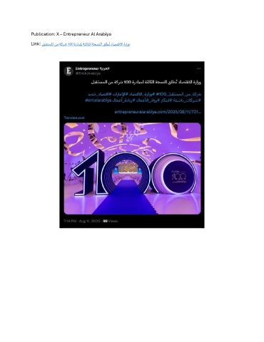 Publication: X – Entrepreneur Al Arabiya ُ Link: لبقتسلما نم ةكرش 100 ةردابلم ةثلاثلا ةخسنلا قلطت داصتقلاا ةرازو