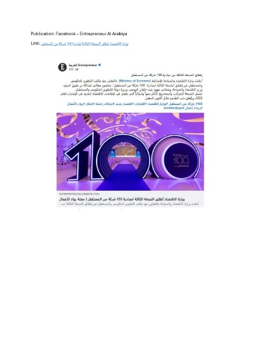 Publication: Facebook – Entrepreneur Al Arabiya ُ Link: لبقتسلما نم ةكرش 100 ةردابلم ةثلاثلا ةخسنلا قلطت داصتقلاا ةرازو