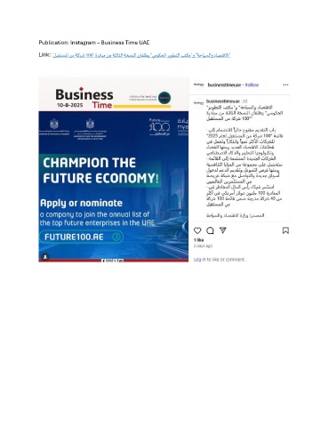 Publication: Instagram – Business Time UAE Link: "لبقتسلما نم ةكرش 100" ةردابم نم ةثلاثلا ةخسنلا ناقلطي "يموكحلا ريوطتلا بتكم"و "ةحايسلاو داصتقلاا"
