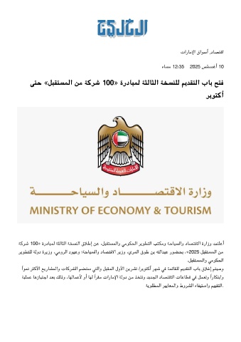 ﺔﻛﺮﺷ 100» ةردﺎﺒﻤﻟ ﺔﺜﻟﺎﺜﻟا ﺔﺨﺴﻨﻟا قﻼﻃإ ﻦﻋ ،ﻞﺒﻘﺘﺴﻤﻟاو ﻣﻮﺤﻟا ﺮﻳﻮﻄﺘﻟا ﺐﺘﻣو ﺔﺣﺎﻴﺴﻟاو دﺎﺼﺘﻗﻻا ةرازو ﺖﻨﻠﻋأ