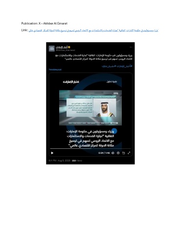 Publication: X – Akhbar Al Emarat Link: يلماع يداصتقا زكرمك ةلودلا ةناكم خيسرت يف مهست ي سورلا داحتلاا عم تارامثتسلااو تامدخلا ةراجت" ةيقافتا :تاراملإا ةموكح يف نولوؤسمو ءارزو"
