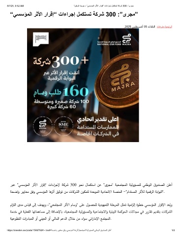 ربﻋ ”ﻲسﺳؤمﻟا رﺛﻷا رارﻗإ“ تاءارﺟﻹ ﺔكرﺷ 300 وحﻧ لﺎمكتﺳا نﻋ ”ى رجﻣ“ ﺔيعمتجمﻟا ﺔيﻟوؤسمﻠﻟ ﻲنطوﻟا قودنصﻟا نﻠﻋأ
