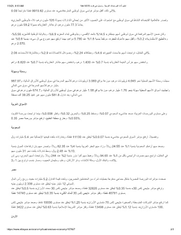 دﻧﻋ %0.8 ﺔﺑﺳﻧﺑ ،«ﻲﺳ لإ ﻲﺑ جورﺑ» مﮭﺳ ﻊﻔﺗرا ﺎﻣﻧﯾﺑ ،مھارد 5.790 دﻧﻋ %1.8 ﺔﺑﺳﻧﺑ ً ﺎﻌﻔﺗرﻣ ،«رﻔﺣﻠﻟ كوﻧدأ» مﮭﺳ لﻔﻗأو ،%3.2 «ﺔﯾرﺎﻣﺛﺗﺳﻻا ﺞﯾﻠﺧﻟا»و