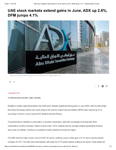 7/2/25, 11:07 AM UAE stock markets extend gains in June, ADX up 2.8%, DFM jumps 4.1% - Aletihad News Center
