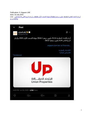 Publication: X- Argaam UAE Date: 31 July 2025 Link: نويلم 8.74 يناثلا عبرلا حابرأو..2025 لولأا فصنلا ةياهنب )%58-( مهرد نويلم 14.55 ةيراقعلا داحتلاا حابرأ مهرد(-52%) 1