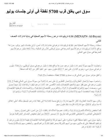 ﻒﺼﻨﻟا تﻻواﺪﺗ ﺔﯾاﺪﺑ ﻲﻓ ﺔﯿﻠﺤﻤﻟا ﻢﮭﺳﻷا ﺔﻠﻤﺳر ﻢھرد تﺎﻧﻮﯿﻠﯾﺮﺗ 4.06 (MENAFN- Al-Bayan)