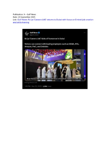 Publication: X – Gulf News Date: 23 September 2025 Link: Gulf News: Ru’ya 'Careers UAE' returns to Dubai with focus on Emirati job creation and skills training