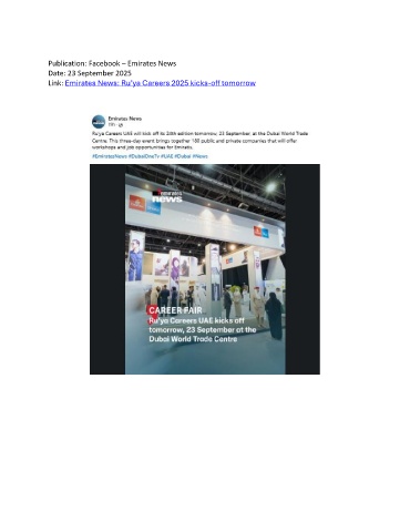 Publication: Facebook – Emirates News Date: 23 September 2025 Link: Emirates News: Ru’ya Careers 2025 kicks-off tomorrow
