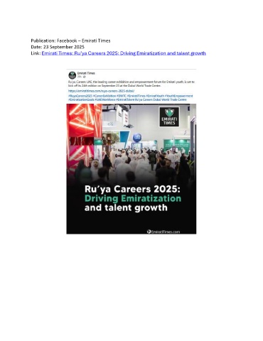 Publication: Facebook – Emirati Times Date: 23 September 2025 Link: Emirati Times: Ru’ya Careers 2025: Driving Emiratization and talent growth