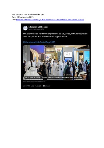 Publication: X – Education Middle East Date: 15 September 2025 Link: Education Middle East: Ru’ya 2025 to connect Emirati talent with future careers