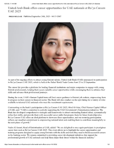 9/24/25, 11:44 AM United Arab Bank offers career opportunities for UAE nationals at Ru’ya Careers UAE 2025 | Al Bawaba