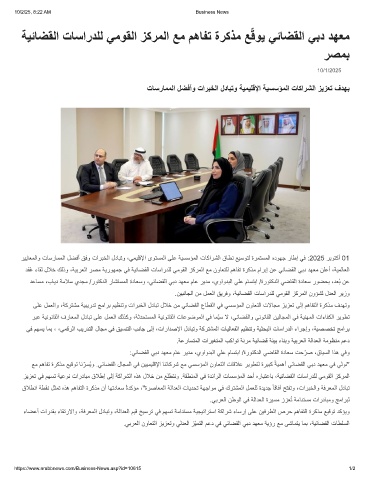 دﻘُﻋ ءﺎﻘﻟ لﻼﺧ كﻟذو ،ﺔﯾﺑرﻌﻟا رﺻﻣ ﺔﯾروﮭﻣﺟ ﻲﻓ ﺔﯾﺋﺎﺿﻘﻟا تﺎﺳاردﻠﻟ ﻲﻣوﻘﻟا زﻛرﻣﻟا ﻊﻣ نوﺎﻌﺗﻠﻟ مھﺎﻔﺗ ةرﻛذﻣ مارﺑإ نﻋ ﻲﺋﺎﺿﻘﻟا ﻲﺑد دﮭﻌﻣ نﻠﻋأ ،ﺔﯾﻣﻟﺎﻌﻟا