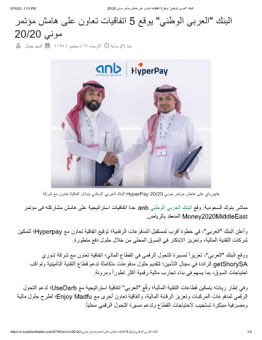 ﺔﻛرﺷ ﻊﻣ نوﺎﻌﺗ ﺔﯾﻗﺎﻔﺗا لدﺎﺑﺗﯾ ﻲﻧطوﻟا ﻲﺑرﻌﻟا كﻧﺑﻟا HyperPay 20/20 ﻲﻧوﻣ رﻣﺗوﻣ شﻣﺎھ ﻰﻠﻋ يﺎﺑرﺑﯾﺎھ