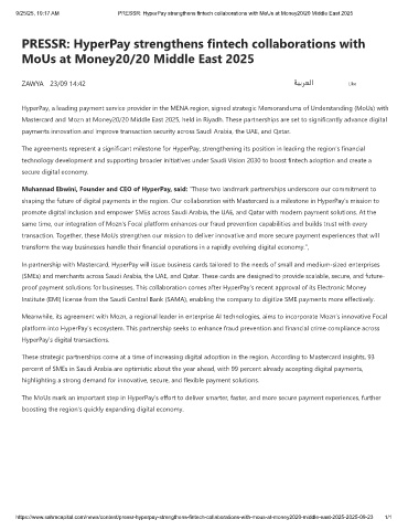 9/25/25, 10:17 AM PRESSR: HyperPay strengthens fintech collaborations with MoUs at Money20/20 Middle East 2025