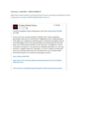 Publication: LINKEDIN – FINTECH FINANCE Link: https://www.linkedin.com/posts/fintech-finance_hyperpay-strengthens-fintech- collaborations-activity-7376601596350324737-ZHyx/ c