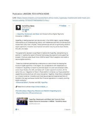 Publication: LINKEDIN- TECH AFRICA NEWS Link: https://www.linkedin.com/posts/tech-africa-news_hyperpay-mastercard-and-mozn-join- forces-activity-7376243774856806415-YIuL/