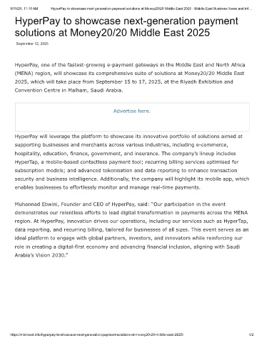9/15/25, 11:10 AM HyperPay to showcase next-generation payment solutions at Money20/20 Middle East 2025 - Middle East Business News and Inf…