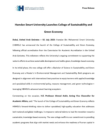 Hamdan Smart University Launches College of Sustainability and