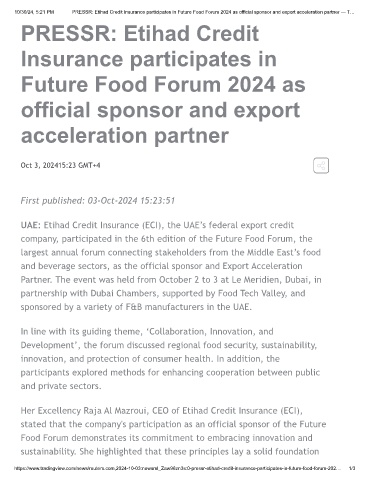 10/30/24, 5:21 PM PRESSR: Etihad Credit Insurance participates in Future Food Forum 2024 as official sponsor and export acceleration partner — T…