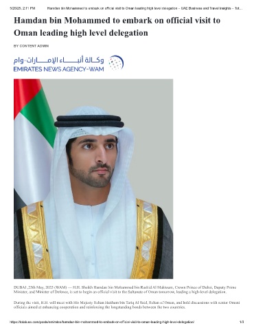 5/26/25, 2:11 PM Hamdan bin Mohammed to embark on official visit to Oman leading high level delegation – UAE Business and Travel Insights – Tot…