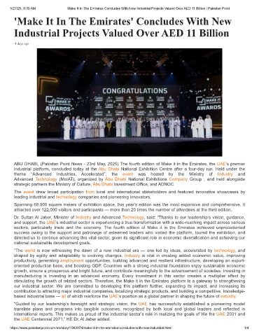 5/27/25, 8:30 AM Make It In The Emirates Concludes With New Industrial Projects Valued Over AED 11 Billion | Pakistan Point