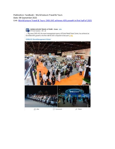 Publication: Facebook – World Leisure Travel & Tours Date: 09 September 2025 Link: World Leisure Travel & Tours: DXB LIVE achieves 40% growth in first half of 2025