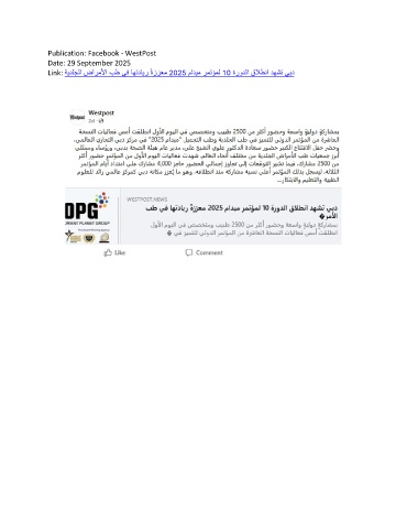Publication: Facebook - WestPost Date: 29 September 2025 Link: ةيدلجلا ضارملأا بط يف اهتداير ًةززعم 2025 ماديم رمتؤمل 10 ةرودلا قلاطنا دهشت يبد