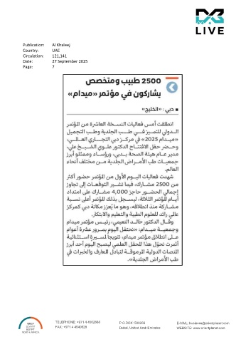 Publication: Al Khaleej Country: UAE Circulation: 121,141 Date: 27 September 2025 Page: 7 TELEPHONE: +971 4 4562888 P.O.BOX: 500266 E-MAIL: business@orientplanet.com FAX: +971 4 4549528 Dubai, United Arab Emirates WEBSITE: www.orientplanet.com
