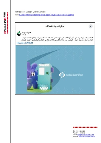 Publication: Facebook -UAENewsArabic Title: EAD’s bottle return scheme drives record recycling success with Sparklo Tel: 971 4 4546093 Fax: 971 4 3612432 E-mail: info@communigateme.com Website: www.communigateme.com