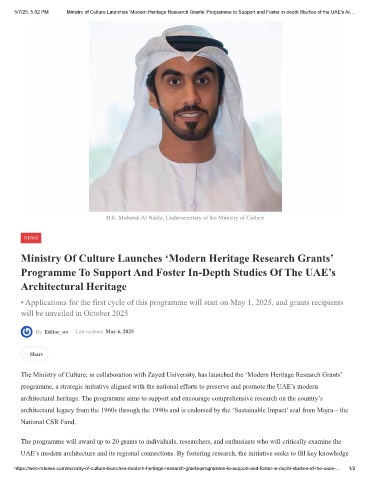 5/7/25, 5:02 PM Ministry of Culture Launches ‘Modern Heritage Research Grants’ Programme to Support and Foster in-depth Studies of the UAE's Ar…
