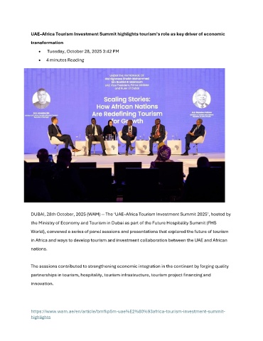 DUBAI, 28th October, 2025 (WAM) -- The ‘UAE–Africa Tourism Investment Summit 2025’, hosted by