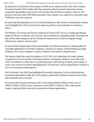 10/29/25, 3:00 PM US$110 billion in UAE investments in Africa position country as world's fourth-largest investor: Bin Touq