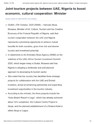 10/29/25, 3:37 PM Joint tourism projects between UAE, Nigeria to boost economic, cultural cooperation: Minister | Emirates News Agency