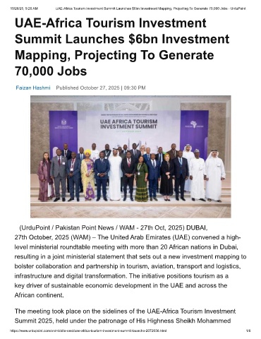 10/28/25, 9:26 AM UAE-Africa Tourism Investment Summit Launches $6bn Investment Mapping, Projecting To Generate 70,000 Jobs - UrduPoint