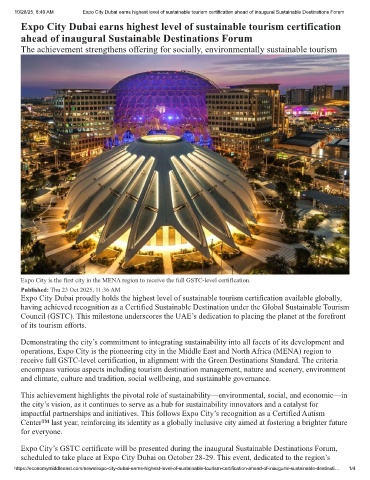 https://economymiddleeast.com/news/expo-city-dubai-earns-highest-level-of-sustainable-tourism-certification-ahead-of-inaugural-sustainable-destinati… 1/4