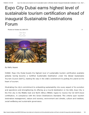 https://www.biztoday.news/2025/10/22/expo-city-dubai-earns-highest-level-of-sustainable-tourism-certification-ahead-of-inaugural-sustainable-destinati… 1/4