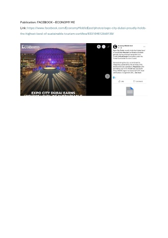 Publication: FACEBOOK – ECONOMY ME Link: https://www.facebook.com/EconomyMiddleEast/photos/expo-city-dubai-proudly-holds- the-highest-level-of-sustainable-tourism-certifica/833104612559139/