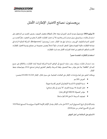 يف ةدئارلا ةيلماعلا ةكرشلا ،) Bridgestone ( "نوتسجيرب" مدقت ،راطلإا اذه يفو .اهتاعارم بجي يتلا فورظلاو ةينفلا ريياعلما